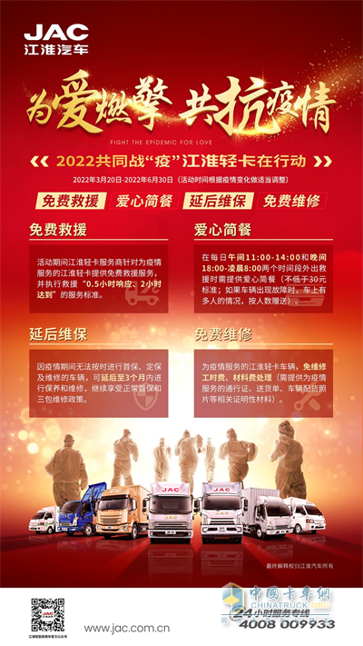 自2020年疫情初次爆發(fā),到后期每一次疫情風(fēng)險升級,西安疫情、河南疫情,以及這次涉及多省市的疫情“倒春寒”。連續(xù)三年,江淮輕卡第一時間快速響應(yīng),制定了免費(fèi)救援、愛心簡餐、延后維保、免費(fèi)維修等一系列專屬服務(wù)政策,助力卡友安心抗疫,保障民生及防疫物資運(yùn)輸安全,為神州“逆行者”保駕護(hù)航!
