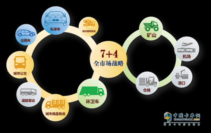 2012年,比亞迪成立卡車項目組,首款物流車項目立項啟動。2015年提出‘7+4’全市場戰(zhàn)略,包括城市建筑物流、城市商品物流、環(huán)衛(wèi)等七大常規(guī)領(lǐng)域及倉儲、港口、機(jī)場、礦山等四大特殊領(lǐng)域車輛電動化。