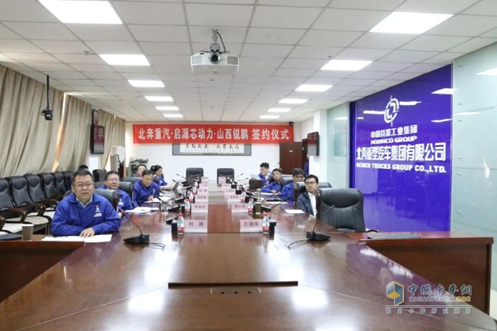 本次簽約儀式采取“線上+線下”形式召開,北奔重汽黨委書記、董事長何清,中國兵器首席科學(xué)家周亞偉,上海啟源芯動力科技有限公司戰(zhàn)略營銷部總經(jīng)理李小宮等領(lǐng)導(dǎo)在北奔重汽主會場出席見證簽約。上海啟源芯動力科技有限公司總經(jīng)理蔡寧,副總經(jīng)理郭鵬,副總經(jīng)理劉須寶,副總經(jīng)理王若蒙,山西銳鵬新能源科技有限公司董事長張寧容等領(lǐng)導(dǎo)分別在各自分會場出席見證簽約。