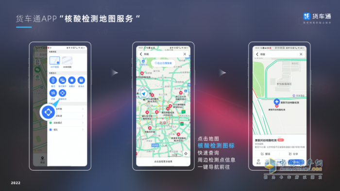 48小時(shí)核酸報(bào)告成為剛需,貨車通已于去年上線“核酸地圖”服務(wù)。司機(jī)在??亢螅赏ㄟ^點(diǎn)擊地圖上的核酸檢測機(jī)構(gòu)圖標(biāo),或通過搜索,進(jìn)行周邊檢測點(diǎn)信息的快速查詢,一鍵導(dǎo)航前往。