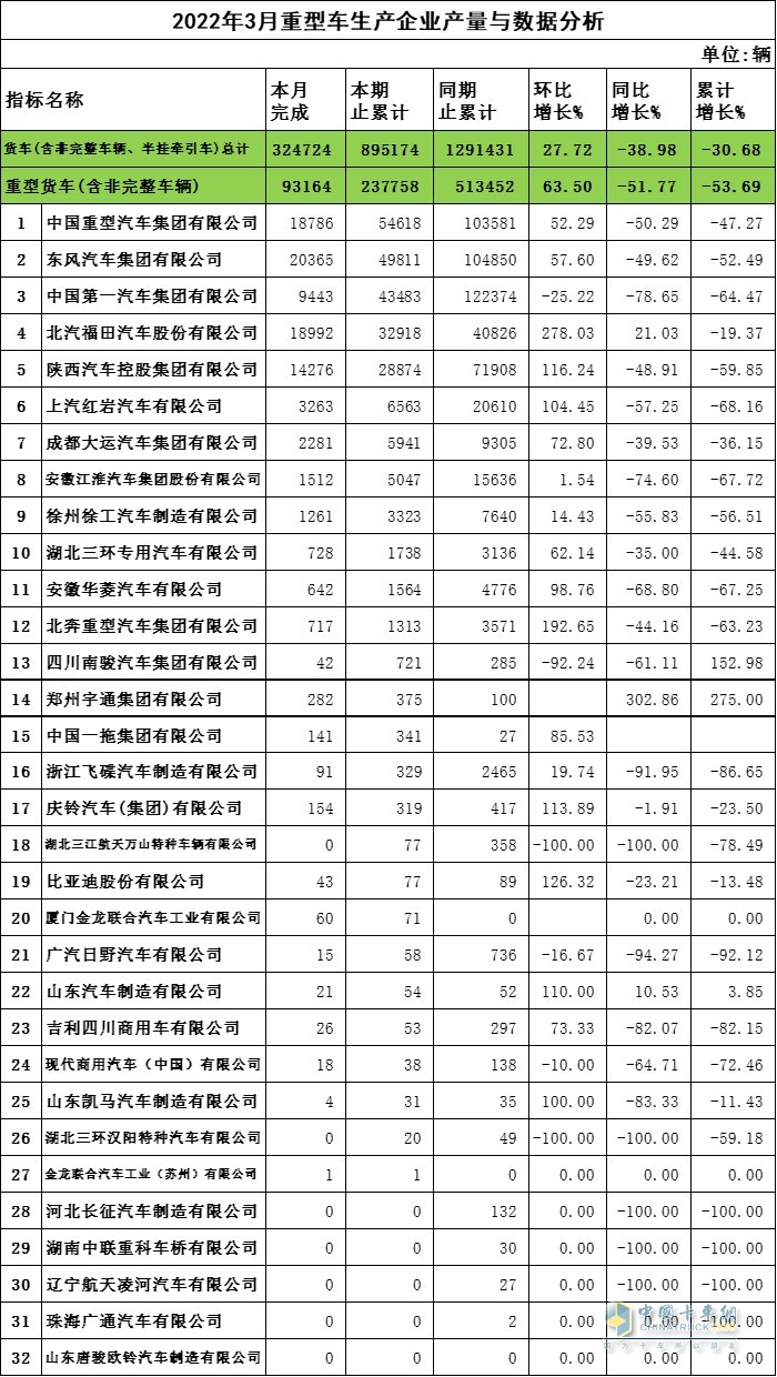 2022年3月重卡企業(yè)產(chǎn)量與數(shù)據(jù)分析