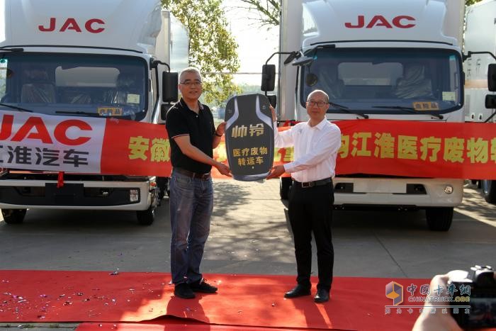 江淮輕型商用車營銷公司總經(jīng)理助理陳哲冰為安徽浩悅環(huán)境科技有限責(zé)任公司副總經(jīng)理高巍交付金鑰匙