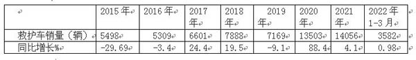 表1,2015-2022年1-3月年我國救護車銷量情況統(tǒng)計(數(shù)據(jù)來源:中國信通院及終端上牌信息)