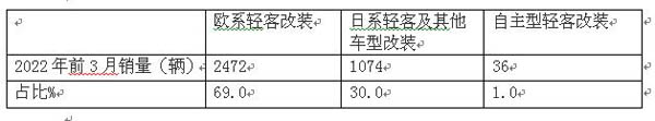 可見,在2022年前3月救護車的市場銷量中,歐系輕客類占據(jù)近7成的份額(69%),處于絕對的優(yōu)勢地位,而日系輕客及其他類改裝占據(jù)3成的市場份額。主要是由于歐系輕客一方面空間較大,便于改裝,二是歐系輕客一般是發(fā)動機前置型造型,更符合國家453號法規(guī)安全條件,在上牌、年審等方面更順暢,因此更能得到市場青睞。