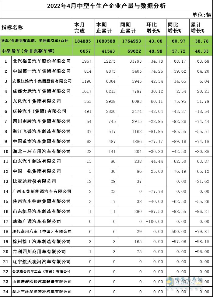 2022年4月份中型貨車完成產(chǎn)量6657,環(huán)比增長-48.98%,同比增長-57.72%,累計增長-40.33%。排名前三的企業(yè)為北汽福田汽車股份有限公司、成都大運(yùn)汽車集團(tuán)有限公司、安徽江淮汽車集團(tuán)股份有限公司。