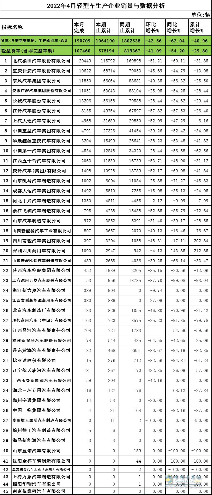 2022年4月輕卡企業(yè)銷量與數(shù)據(jù)分析