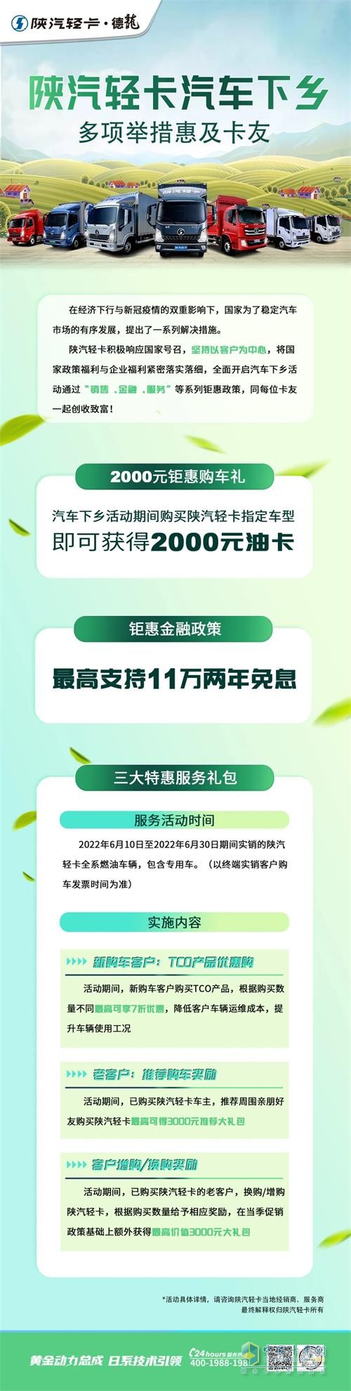 陜汽輕卡積極響應(yīng)國家號召,堅持以客戶為中心,將國家政策福利與企業(yè)福利緊密落實落細,全面開啟汽車下鄉(xiāng)活動。通過“銷售、金融、服務(wù)”等系列鉅惠政策,同每位卡友一起創(chuàng)收致富!