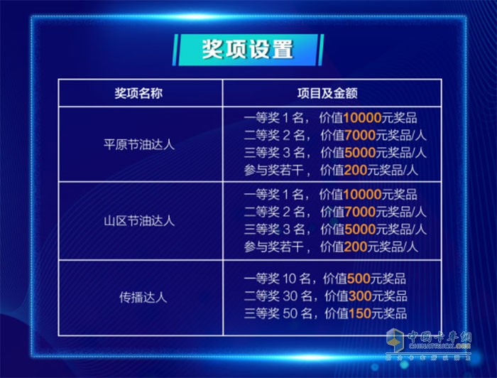比賽不僅為高規(guī)格設(shè)置了“平原組”和“山區(qū)組”兩大組別一等獎、二等獎、三等獎以及若干參與獎的獎項,一等獎單項獎品最高價值可達1萬元。最終,比賽點贊量靠前的90位參賽選手,還有機會贏取與此相關(guān)的“傳播達人”額外嘉獎及禮品。擁有J6V卡車的解放用戶千萬不要猶豫,趕快加入“解放J6V節(jié)油大賽”吧!
