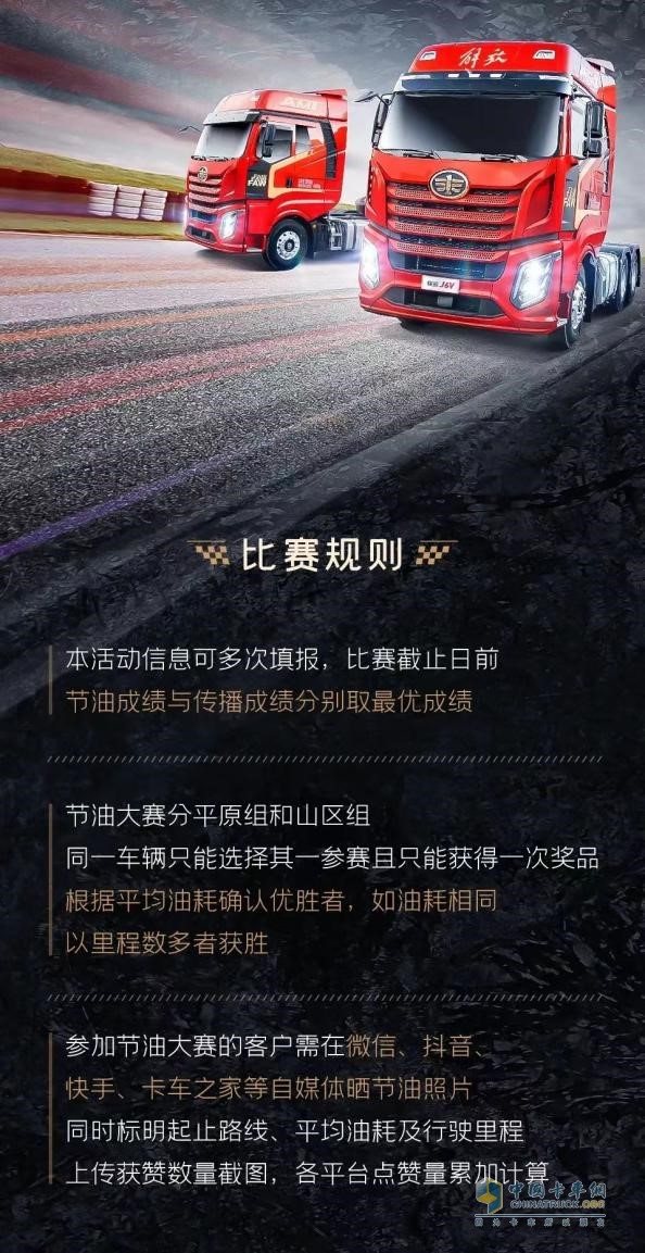 3、參加節(jié)油大賽的客戶需在微信、抖音、快手、卡車之家等傳播平臺曬照片分享傳播解放J6V節(jié)油效果,并標明起止路線、平均油耗及行駛里程。上傳獲贊數(shù)量截圖,各平臺點贊量累加計算。