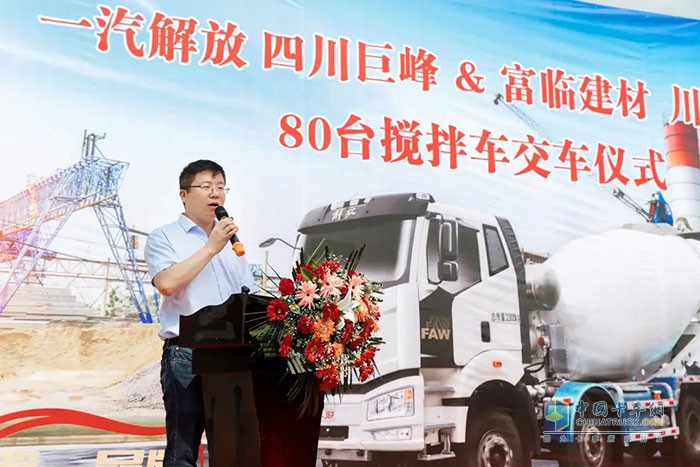 一汽解放銷售公司四川商代處經(jīng)理謝乾坤現(xiàn)場(chǎng)致辭:解放攪拌車一直以高效、節(jié)油、安全、可靠著稱,為不負(fù)廣大用戶朋友的信任,解放一直在創(chuàng)新跨越的路上奮勇前行,力求以更加優(yōu)秀的產(chǎn)品回饋大家。解放秉持著“創(chuàng)新、協(xié)調(diào)、綠色、開放”的發(fā)展態(tài)度,不斷升級(jí)技術(shù)、變革產(chǎn)品,至今已成功為用戶打造出了領(lǐng)先行業(yè)的“低污染、低碳化、低TCO”的解放國(guó)六系列產(chǎn)品,在國(guó)六時(shí)代為用戶提供了綠色低碳、智慧運(yùn)營(yíng)新價(jià)值。我們將為各位在座的朋友們提供最優(yōu)質(zhì)的服務(wù)和最優(yōu)質(zhì)的產(chǎn)品。相信我們的攪拌車必將成為各位發(fā)財(cái)致富的好幫手。