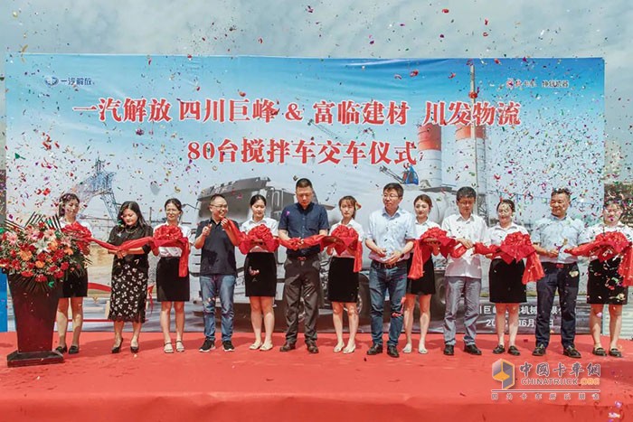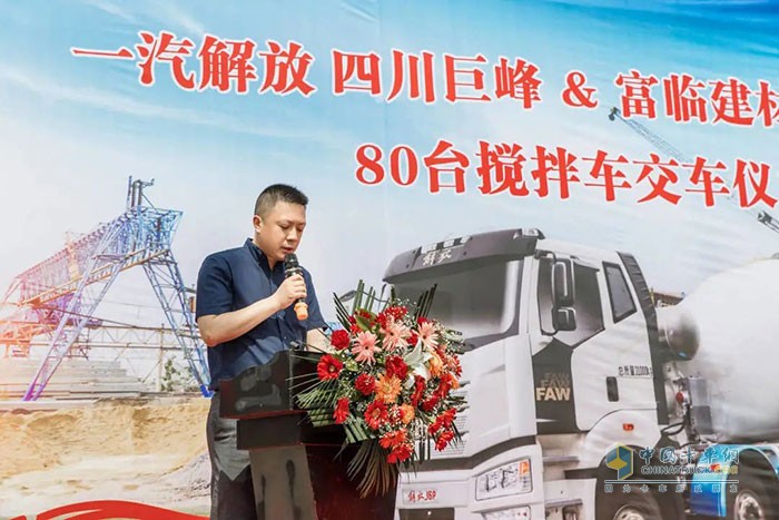 一汽解放銷售公司西南營(yíng)銷部總經(jīng)理李白、一汽解放銷售公司四川商代處經(jīng)理謝乾坤、一汽解放發(fā)動(dòng)機(jī)事業(yè)部川藏分公司經(jīng)理吳風(fēng)雷、四川綿陽(yáng)富臨建筑材料有限公司副總經(jīng)理蘇維、四川綿陽(yáng)富臨建筑材料有限公司財(cái)務(wù)部部長(zhǎng)譚文勇、四川綿陽(yáng)富臨建筑材料有限公司總經(jīng)理助理李鐸、綿陽(yáng)川發(fā)物流有限公司總經(jīng)理趙亮等領(lǐng)導(dǎo)及現(xiàn)場(chǎng)嘉賓共同見(jiàn)證這一重要時(shí)刻。
