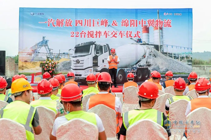 一汽解放銷售公司四川商代處經(jīng)理謝乾坤、一汽解放發(fā)動(dòng)機(jī)事業(yè)部川藏分公司經(jīng)理吳風(fēng)雷、唐山亞特專用汽車有限公司銷售公司副總經(jīng)理趙閻偉、綿陽(yáng)民興商品混凝土有限公司吳總、綿陽(yáng)中翼物流有限公司古總等領(lǐng)導(dǎo)及現(xiàn)場(chǎng)嘉賓共同出席了本次交車盛典。