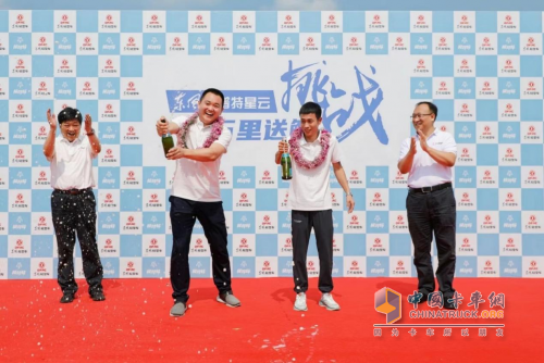活動現(xiàn)場,為慶祝挑戰(zhàn)者王哿和小明凱旋,熊繼海和黃臻代表東風(fēng)汽車股份有限公司為兩位英雄佩戴勝利的花環(huán)。