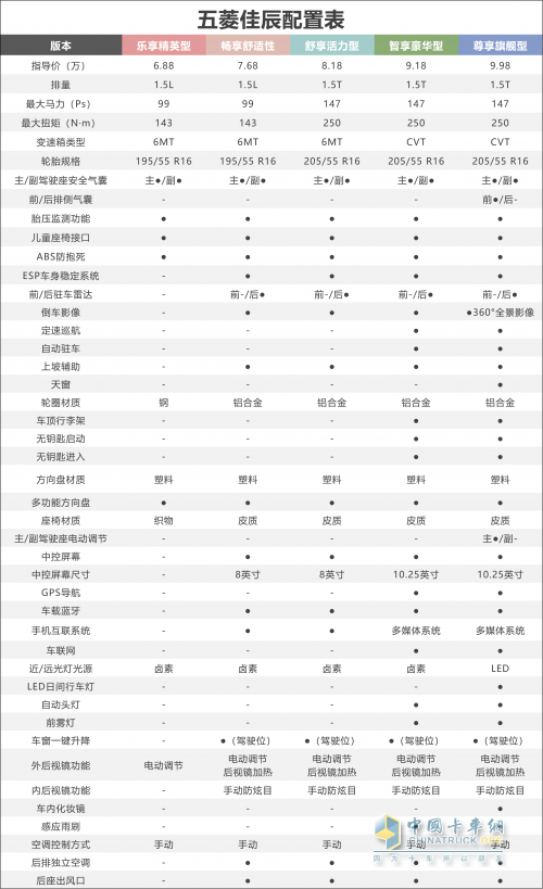 現(xiàn)階段五菱佳辰有5個(gè)車型版本供消費(fèi)者選擇,從配置上來看,個(gè)人認(rèn)為指導(dǎo)價(jià)為6.88萬的入門版車型很明顯是為了拉低起售價(jià),從配置表就能看出,該版本的配置水平可以說是較低,像很多輔助駕駛的配置、中控大屏、等一系列實(shí)用的配置都已經(jīng)取消了,所以并不建議大家考慮。