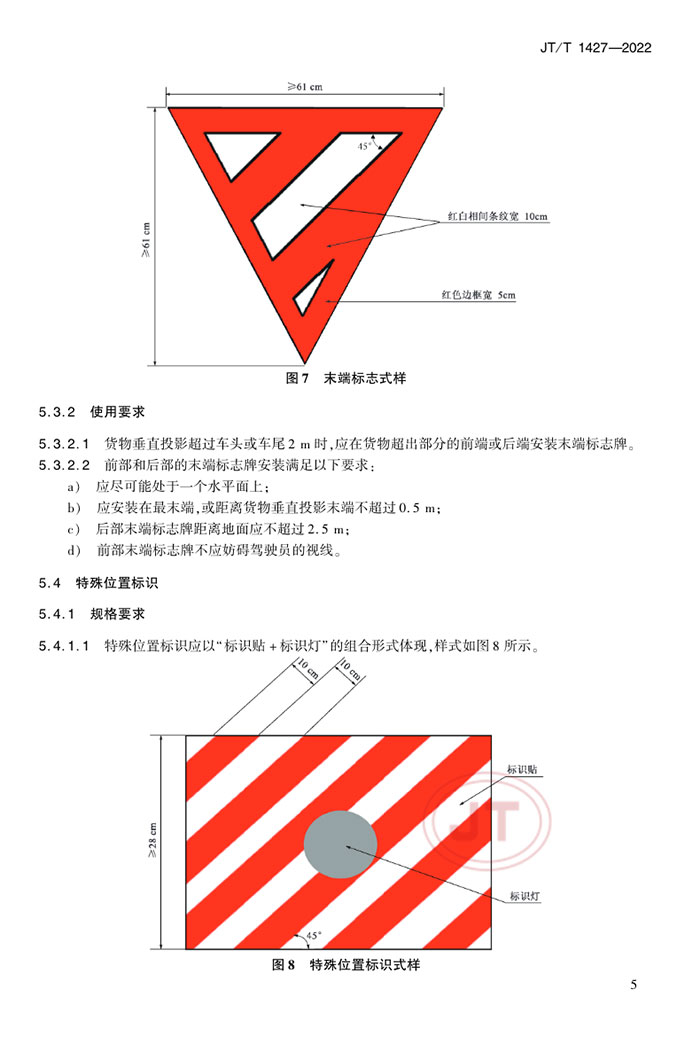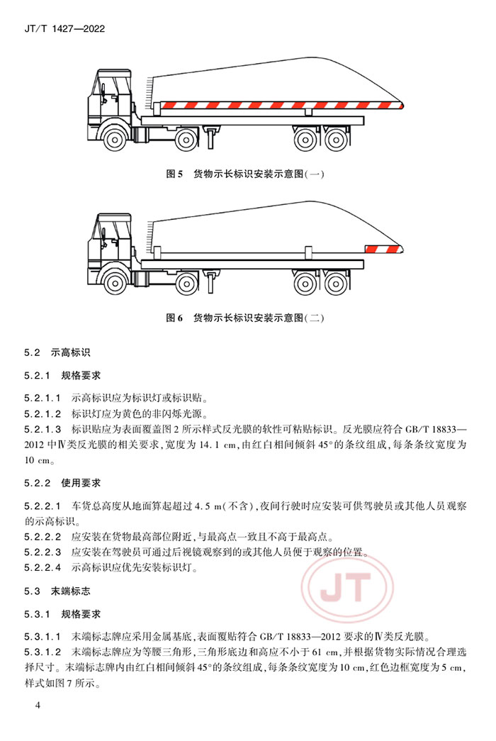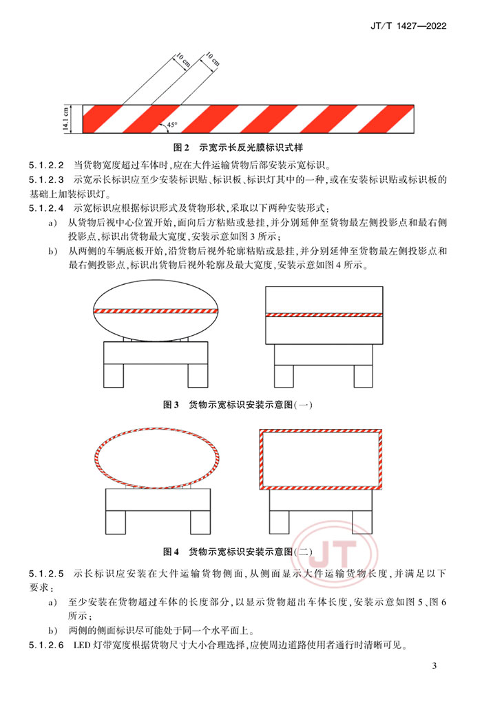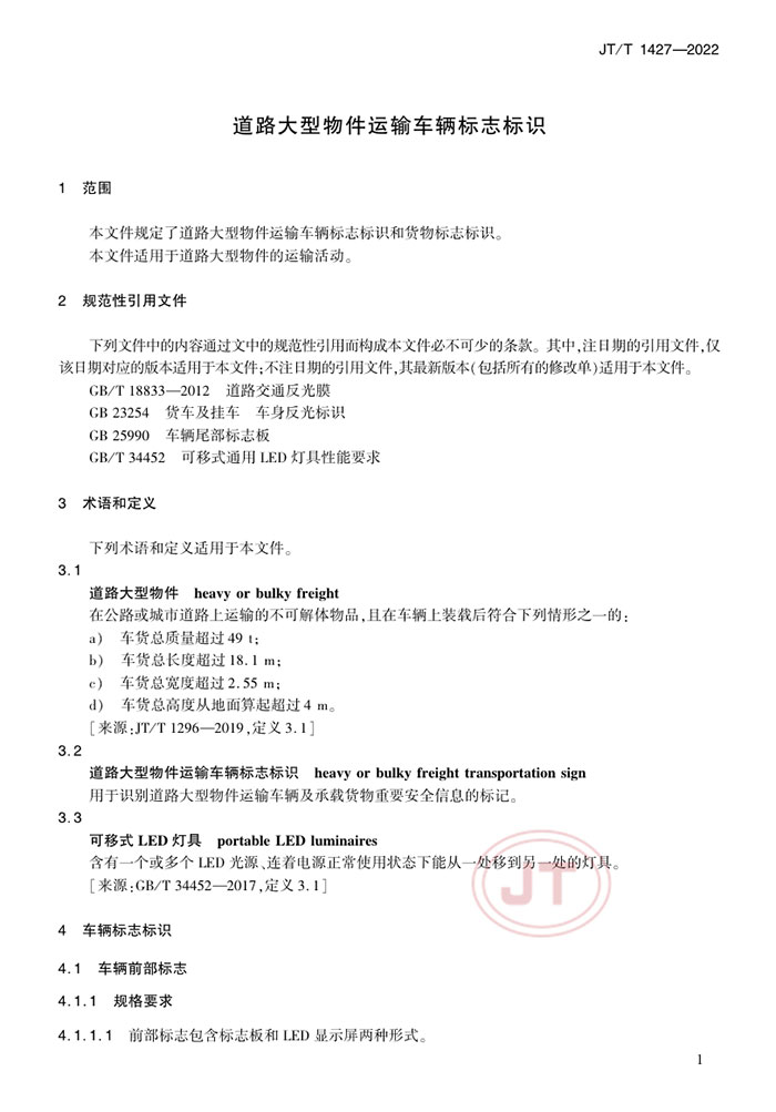 在交通運輸部發(fā)布的一攬子交通運輸重點行業(yè)標準中,《道路大型物件運輸車輛標志標識》一文規(guī)定了道路大型物件運輸車輛標志標識和貨物標志標識,提出了車輛前部標志、車身標志標識的相關(guān)規(guī)定以及貨物示寬示長標識、示高標識、末端標志、特殊位置標識的規(guī)格要求和使用要求等,為保障社會車輛清晰辨識道路大型物件運輸車輛提供技術(shù)支撐,有助于大件運輸企業(yè)進一步規(guī)范運輸活動,有效保障道路交通安全。
