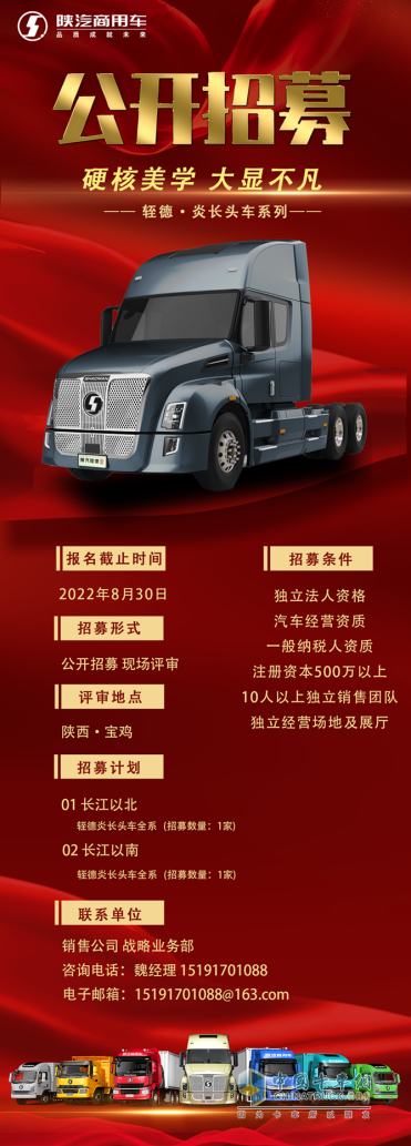 目前,陜汽商用車面向全國,輊德·炎營銷渠道公開招募。合作互利共贏 廠家強勢扶持,期待您的加入!