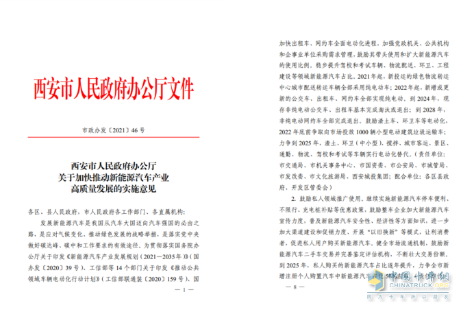 為進(jìn)一步落實黨中央做好碳達(dá)峰、碳中和工作要求,2021年年底,西安市人民政府辦公廳發(fā)布了《關(guān)于加快推動新能源汽車產(chǎn)業(yè)高質(zhì)量發(fā)展的實施意見》。其中提及公共領(lǐng)域全面電動化,提升重載貨車、工程車新能源汽車滲透率。此外,在同一時間段發(fā)布的《促進(jìn)商貿(mào)物流高質(zhì)量發(fā)展若干措施》中也提出要落實新發(fā)展理念,構(gòu)建綠色物流。深入推進(jìn)現(xiàn)代物流節(jié)能減排,加大貨運車輛適用的充電樁、加氫站等配套設(shè)施布局規(guī)劃建設(shè)力度。