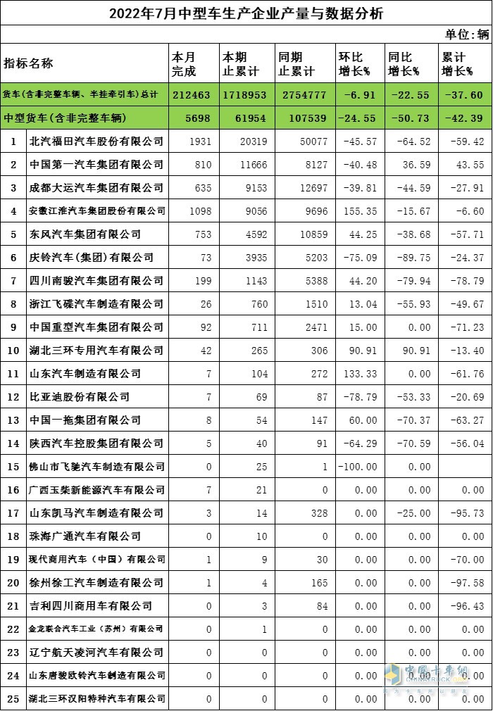2022年7月份中型貨車完成產(chǎn)量5698,環(huán)比增長-24.55%,同比增長-50.73%,累計(jì)增長-42.39%。排名前三的企業(yè)為北汽福田汽車股份有限公司、安徽江淮汽車集團(tuán)股份有限公司、中國第一汽車集團(tuán)有限公司。