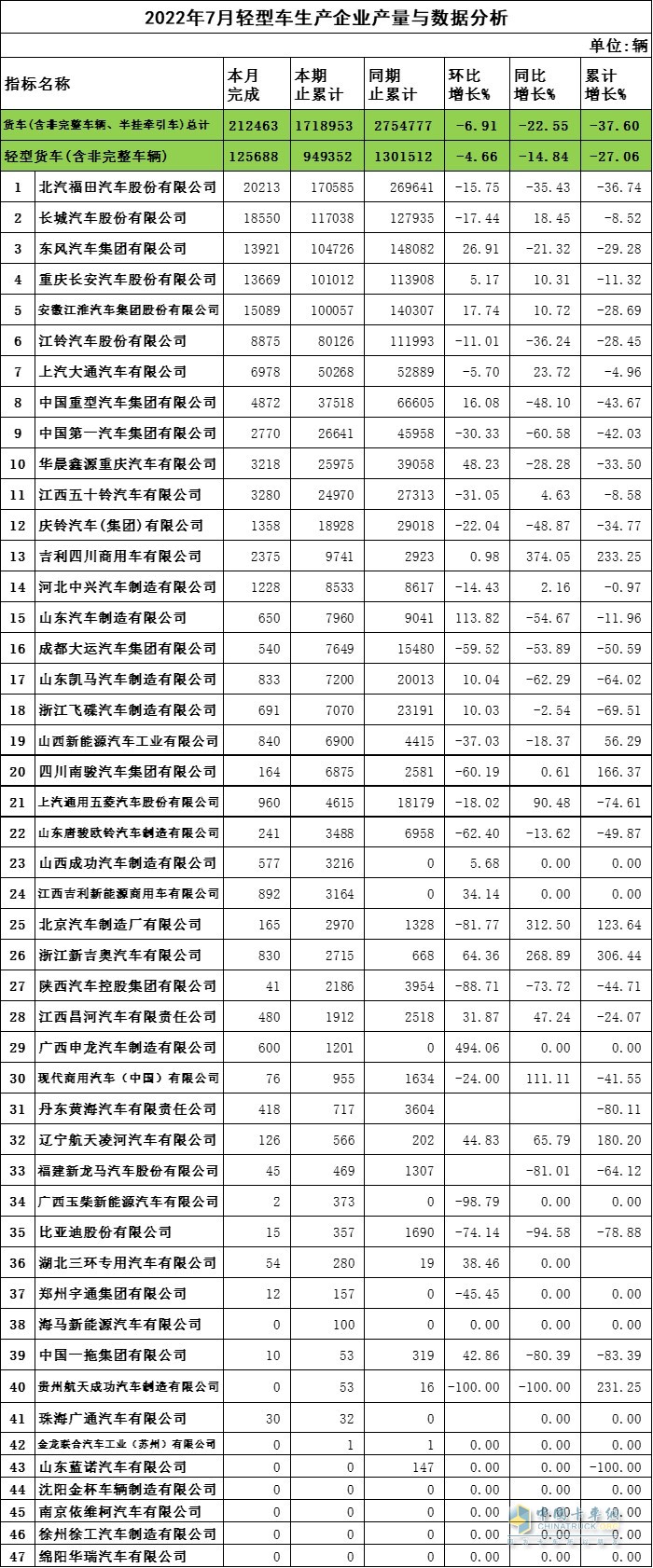 2022年7月份輕型貨車完成產量125688,環(huán)比增長-4.66%,同比增長-14.84%,累計增長-27.06%。排名前三的企業(yè)為北汽福田汽車股份有限公司、長城汽車股份有限公司、安徽江淮汽車集團股份有限公司。