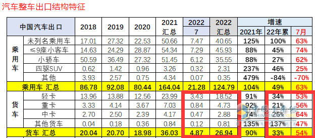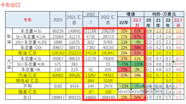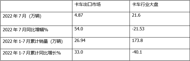 表1,2022年7月及1-7月卡車出口整體市場與卡車行業(yè)大盤比較(數(shù)據(jù)來源:海關(guān)及中汽協(xié))