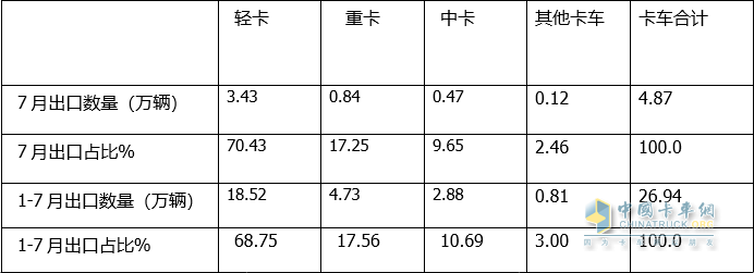 總之,無論是今年7月還是1-7月,輕卡出口占比均在7成左右,可謂一家獨(dú)大,是我國卡車出口的主要細(xì)分車型。