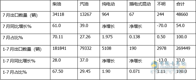值得一提的是,從各類動力車型出口同比增長看,無論是7月還是1-7月,純電動出口數(shù)量同比均為凈增長;說明純電動卡車市場潛力巨大,或許是未來卡車出口市場中的新增長點(diǎn),這一點(diǎn)值得車企關(guān)注。