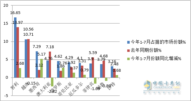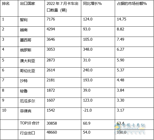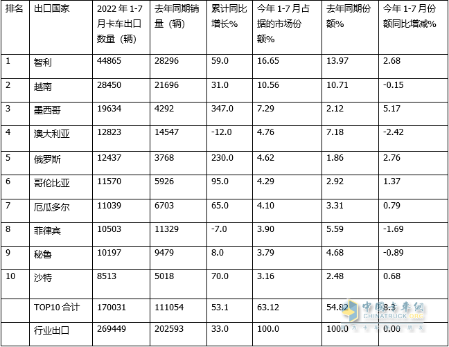 ---出口智利累計數(shù)量最多,也是唯一接近45000輛的國家(同比大增長59,市場份額為16.65%,這是2022年1-7月我國卡車出口賴以較大增長的最為重要的因素之一。