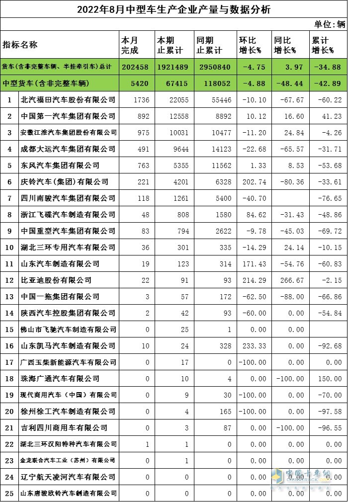 2022年8月份中型貨車完成產(chǎn)量5420,環(huán)比增長-4.88%,同比增長-48.44%,累計增長-42.89%。排名前三的企業(yè)為北汽福田汽車股份有限公司、安徽江淮汽車集團(tuán)股份有限公司、中國第一汽車集團(tuán)有限公司。