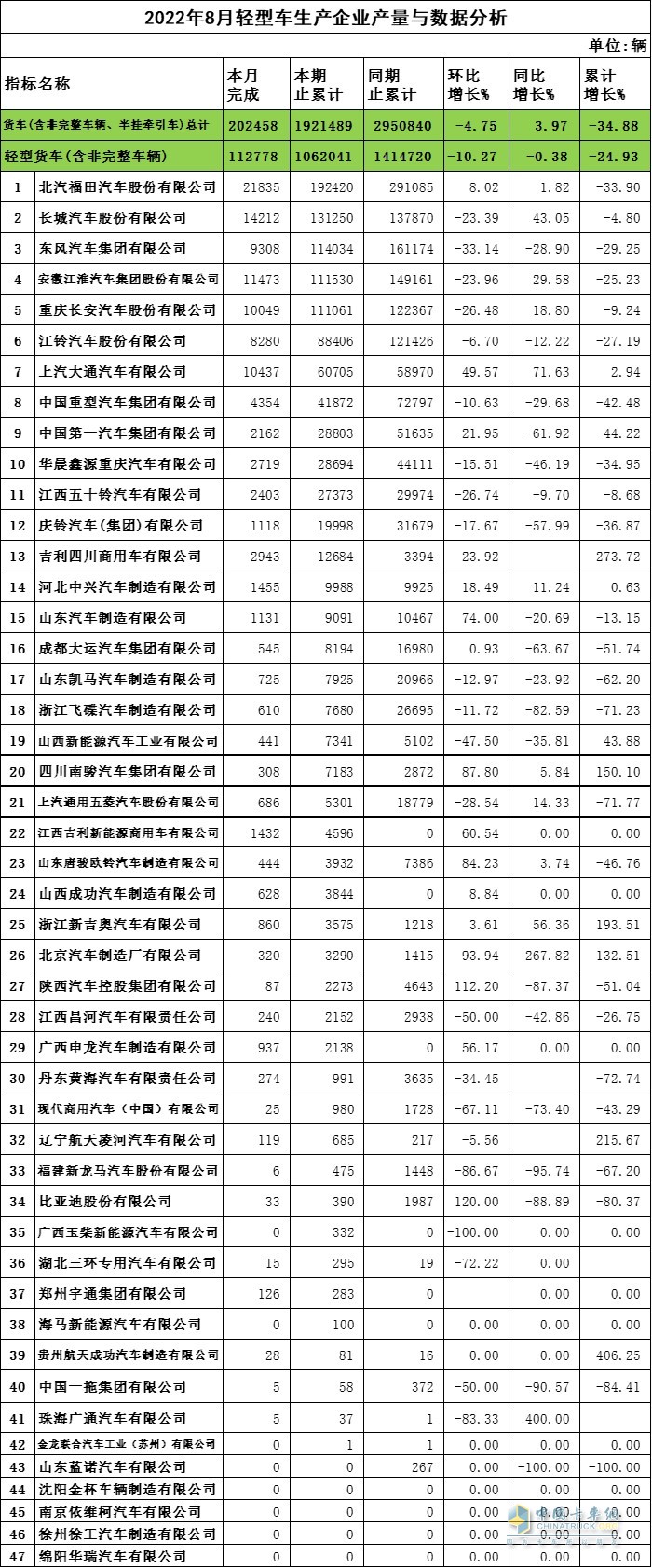 2022年8月輕卡企業(yè)產(chǎn)量與數(shù)據(jù)分析