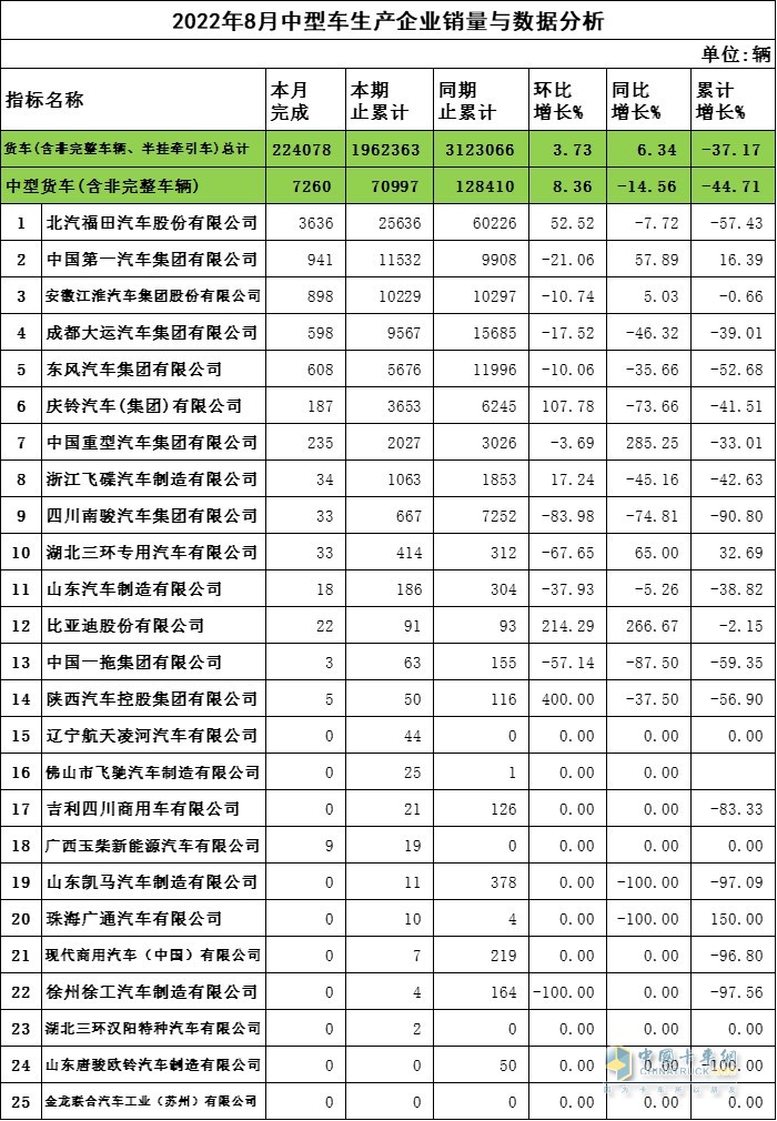 2022年8月份中型貨車完成銷量7260,環(huán)比增長8.36%,同比增長-14.56%,累計增長-44.71%。排名前三的企業(yè)為北汽福田汽車股份有限公司、中國第一汽車集團有限公司、安徽江淮汽車集團股份有限公司。