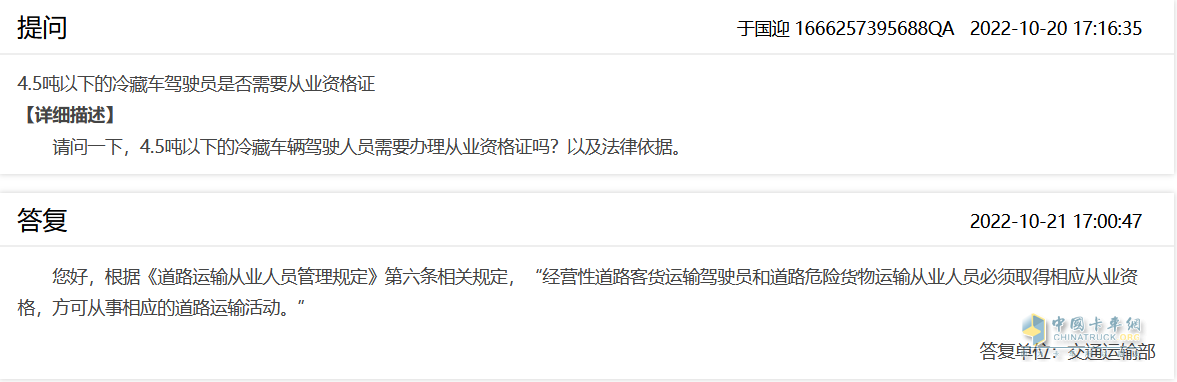4.5噸以下的冷藏車駕駛員是否需要從業(yè)資格證?交通部回復(fù)來了
