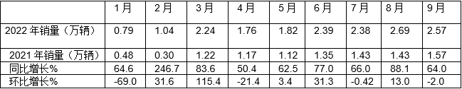 上表顯示,2022年9月新能源專用車銷售2.57萬輛,居今年1-9月各月銷量第二,且同比增長64%,環(huán)比下降2%。