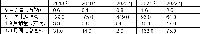 上表可見,在2018—2022年近5年9月中,2022年9月的新能源專用車銷量是唯一超過2萬輛級別的年份,在近年同期居于最高;是第二高的2021年同期銷量的近1.6倍。