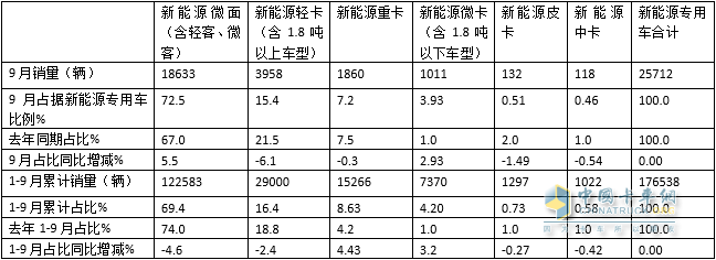 ---新能源(純電動)微卡占比3.93%,是新能源卡車中占比第三大的細分車型,且占比同比增加2.93個百分點,是新能源專用車中占比增加最多的細分車型。也就是說,新能源微卡單月占比同比增加最多,領漲9月新能源專用車大盤,這是今年9月新能源專用車各個細分市場一個明顯特點。