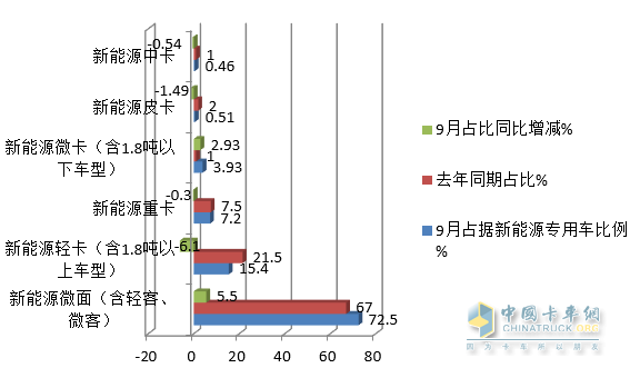 1、9月新能源專用車各細分車型占比及占比同比增減: