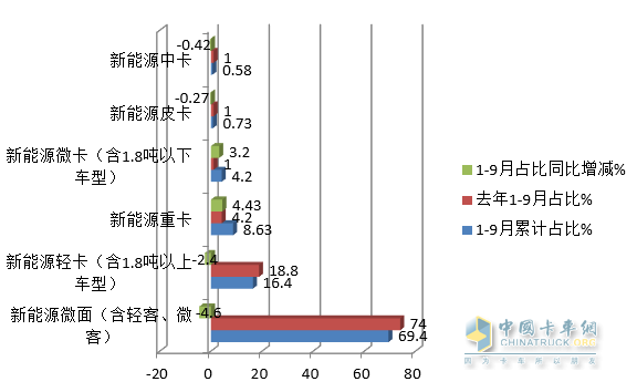 特點四:單月微卡領漲;前三季度新能源重卡占比同比增加最多,表現(xiàn)最搶眼