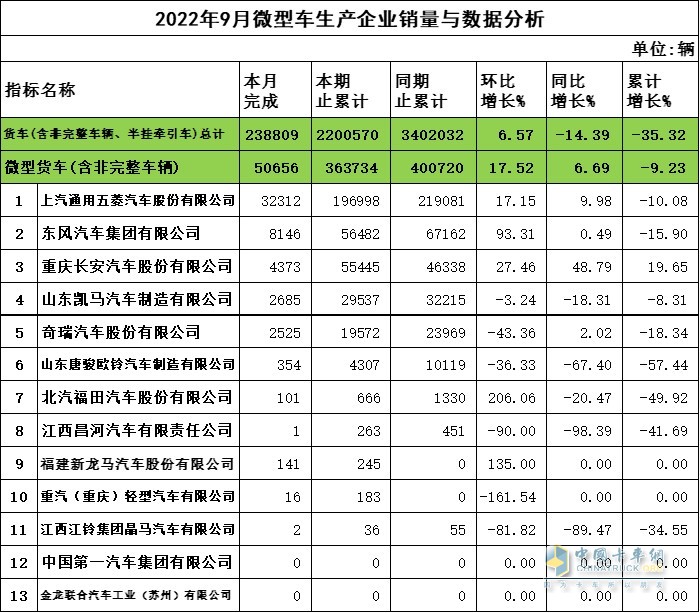 2022年9月微卡企業(yè)銷量與數(shù)據(jù)分析