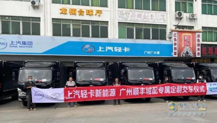 2022年11月10日,上汽輕卡為廣州順豐城配舉行定制交車儀式。本次交車儀式為廣州順豐交付10臺上汽輕卡新能源箱式貨車。