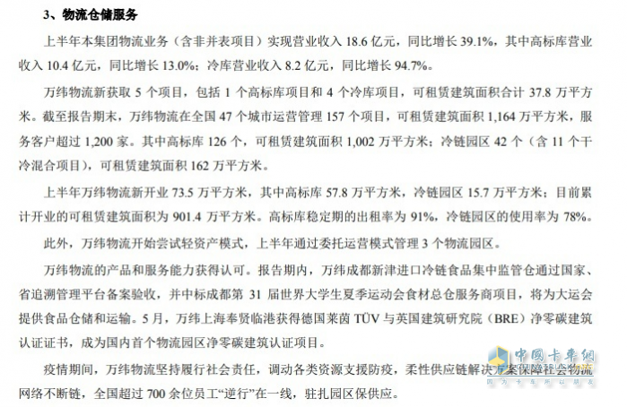值得一提的是,此前,萬(wàn)科A披露半年度報(bào)告。報(bào)告顯示,截至報(bào)告期末,萬(wàn)緯物流在全國(guó)47個(gè)城市運(yùn)營(yíng)管理157個(gè)項(xiàng)目,可租賃建筑面積1164萬(wàn)平方米,服務(wù)客戶超過1200家。其中高標(biāo)庫(kù)126個(gè),可租賃建筑面積1002萬(wàn)平方米;冷鏈園區(qū)42個(gè)(含11個(gè)干冷混合項(xiàng)目),可租賃建筑面積162萬(wàn)平方米。