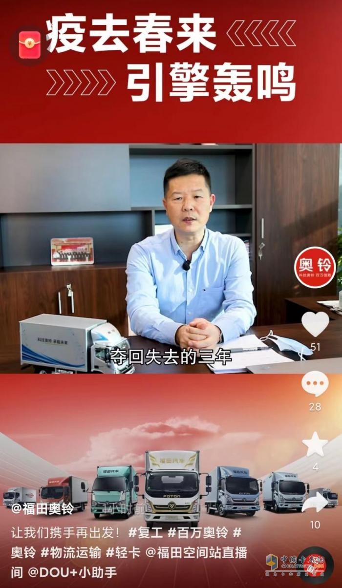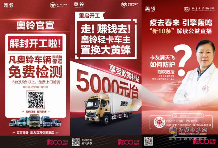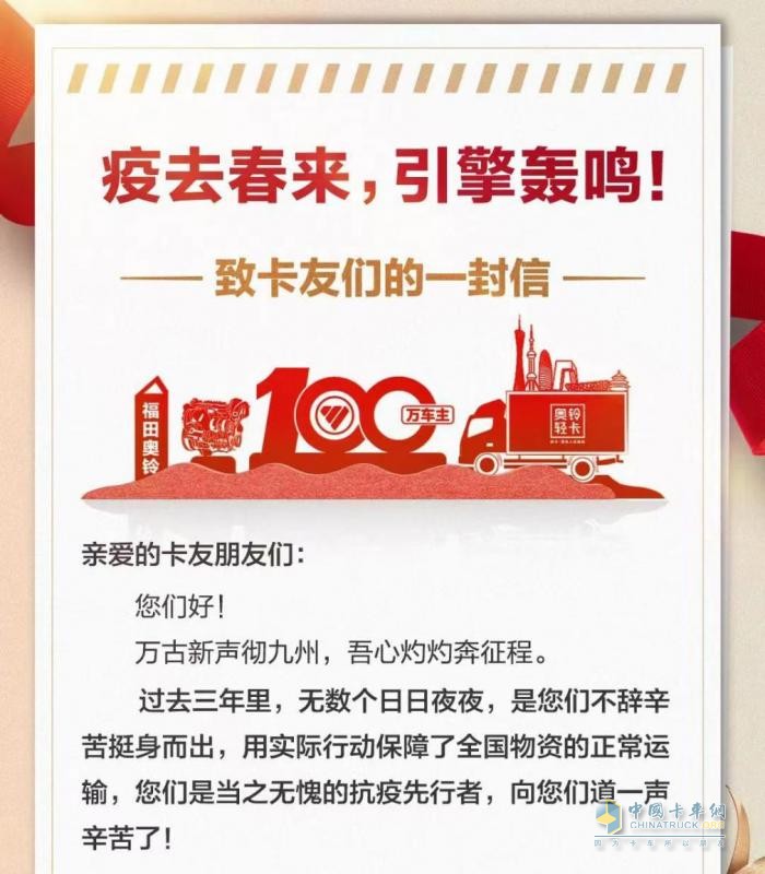 奧鈴事業(yè)部黨委書記、總裁江健在短視頻中表示,奧鈴將積極響應(yīng)國(guó)家疫情防控“新十條”政策,倡議全體經(jīng)銷商行動(dòng)起來(lái),全力為卡友重啟開工保駕護(hù)航,讓卡友的車跑起來(lái),讓引擎的轟鳴聲響起來(lái),讓客戶的生意轉(zhuǎn)起來(lái),攜手再出發(fā),奪回失去的三年。