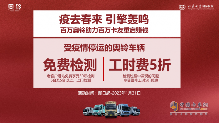 為保障客戶順利復(fù)工復(fù)產(chǎn),奧鈴?fù)瞥隽?ldquo;百萬(wàn)奧鈴助力百萬(wàn)卡友重啟賺錢”計(jì)劃,凡受疫情停運(yùn)的奧鈴車輛,將獲得免費(fèi)檢測(cè),老客戶進(jìn)站免費(fèi)享受30項(xiàng)檢測(cè),5臺(tái)及以上還提供免費(fèi)上門檢查。若檢測(cè)過(guò)程中發(fā)現(xiàn)問(wèn)題,享受維修工時(shí)5折優(yōu)惠(活動(dòng)時(shí)間:即日起-2023年1月31日)。