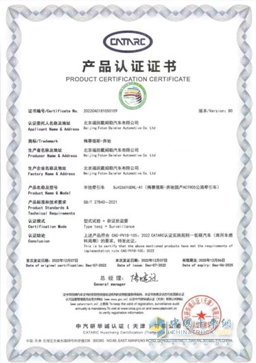 2022年12月7日,梅賽德斯-奔馳國產(chǎn)重卡Actros 6×4公路牽引車獲得中汽研華誠認證(天津)有限公司頒發(fā)的“低碳汽車(商用車燃料周期)”認證證書。這是我國首張商用車低碳項目的認證證書,梅賽德斯-奔馳國產(chǎn)重卡亦成為國內首家通過該認證的商用車企業(yè),提前邁入低碳排放新時代。