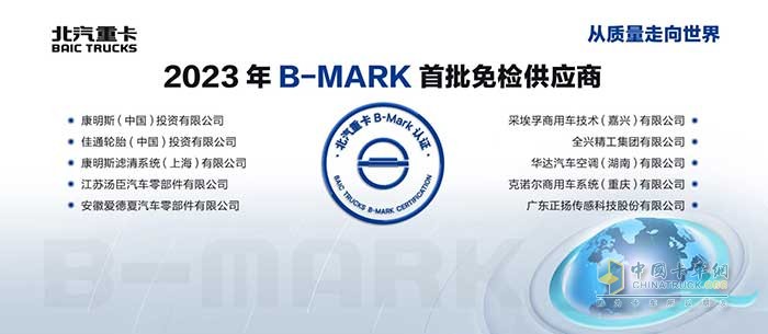 在當(dāng)天的B-MARK大會,北汽重卡公布了首批10家供應(yīng)商用獲得B-MARK免檢供應(yīng)商證書,這些供應(yīng)商包括康明斯(中國)、采埃孚、佳通輪胎、康明斯濾清系統(tǒng)、全興精工、華達(dá)汽車空調(diào)、克諾爾等。