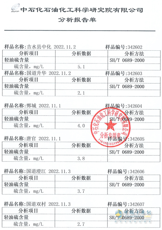 實測全程,中國卡車網(wǎng)路測中心在沿途多個地方連鎖加油站對實測車輛歐曼GTL國六重卡進行了加油,并進行柴油快速檢測和油樣封存,最終把所有油樣送至了中國石化石油化工科學(xué)研究院油品檢測中心進行檢測,結(jié)果如下: