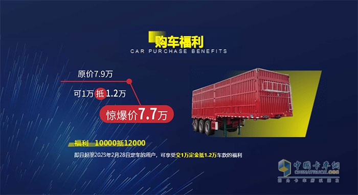 而為了助力卡友實(shí)現(xiàn)購(gòu)車(chē)成本降低,首達(dá)汽車(chē)決定,凡是2023年2月28日前定車(chē)的用戶(hù),都可以參加交10000元定金抵12000元車(chē)款的優(yōu)惠活動(dòng),整車(chē)價(jià)格再次優(yōu)惠2000元,標(biāo)配最低售價(jià)為77000元,真正為用戶(hù)提升了產(chǎn)品的性?xún)r(jià)比。