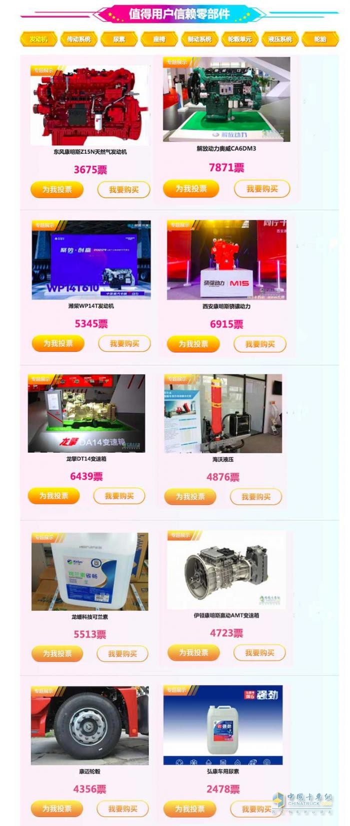 當(dāng)然,零部件作為卡車的重要部分同樣備受用戶的關(guān)注,尤其在動力鏈的選擇上更是重中之重。第八屆發(fā)現(xiàn)信賴組委會深諳用戶的實(shí)際需求,對發(fā)動機(jī)、變速箱、車用尿素、傳動系統(tǒng)、液壓系統(tǒng)等進(jìn)行了評選,得到了解放動力、濰柴、福田康明斯、西安康明斯、伊頓康明斯、可蘭素、弘康、龍擎、采埃孚、克諾爾、海沃、康邁等零部件企業(yè)的積極參與。