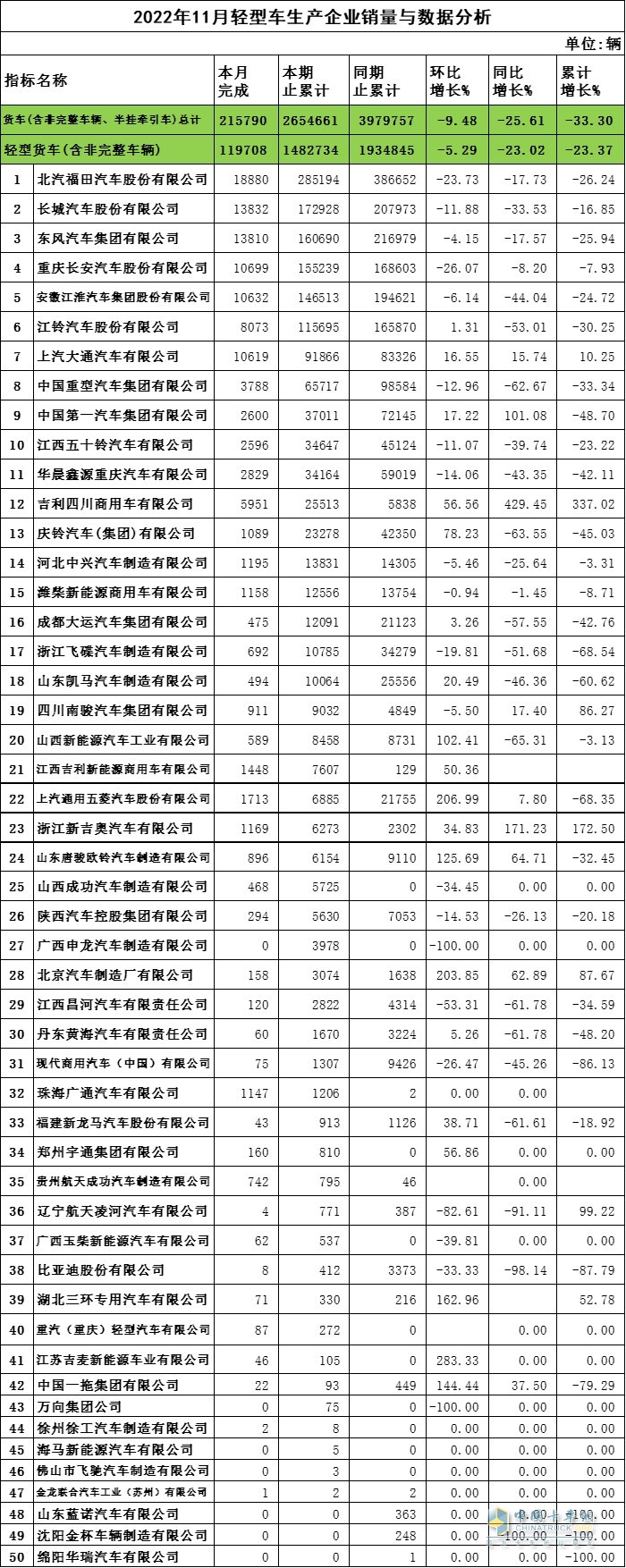 2022年11月輕卡企業(yè)銷(xiāo)量與數(shù)據(jù)分析