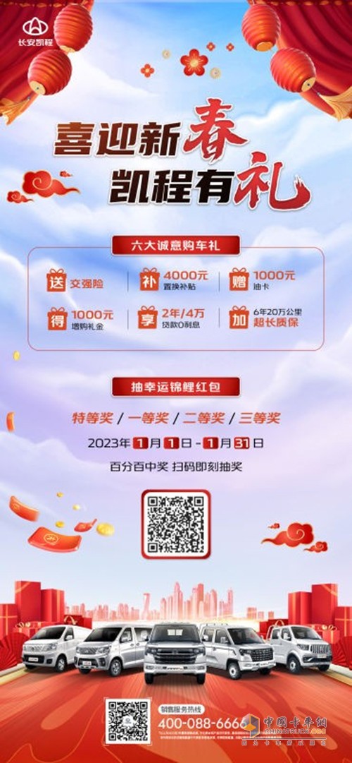 2023伊始,為助力廣大用戶惠購新車,長安凱程還推出“喜迎新春 凱程有禮”活動,全系車型至多可享六大誠意購車禮,具體為: