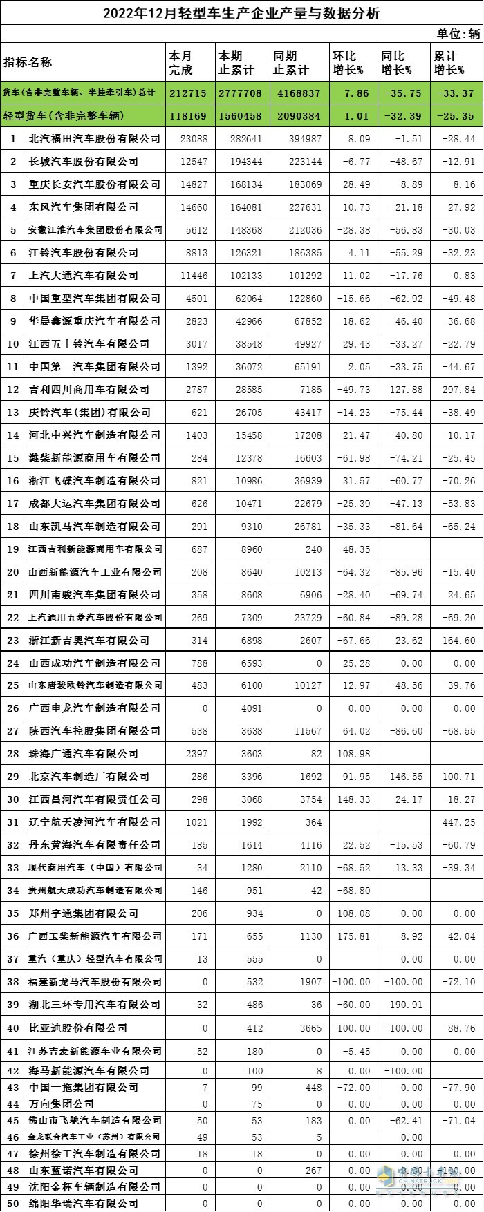 2022年12月輕卡企業(yè)產(chǎn)量與數(shù)據(jù)分析