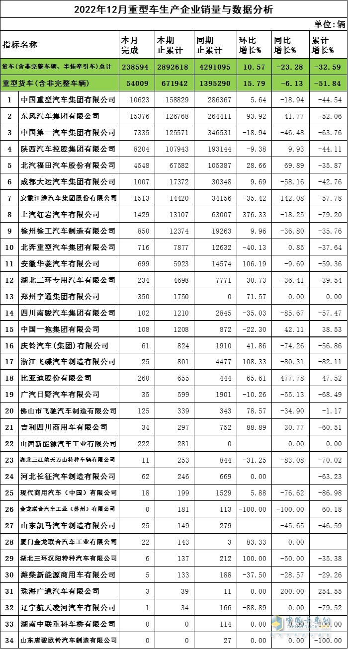 2022年12月重卡企業(yè)銷量與數(shù)據(jù)分析